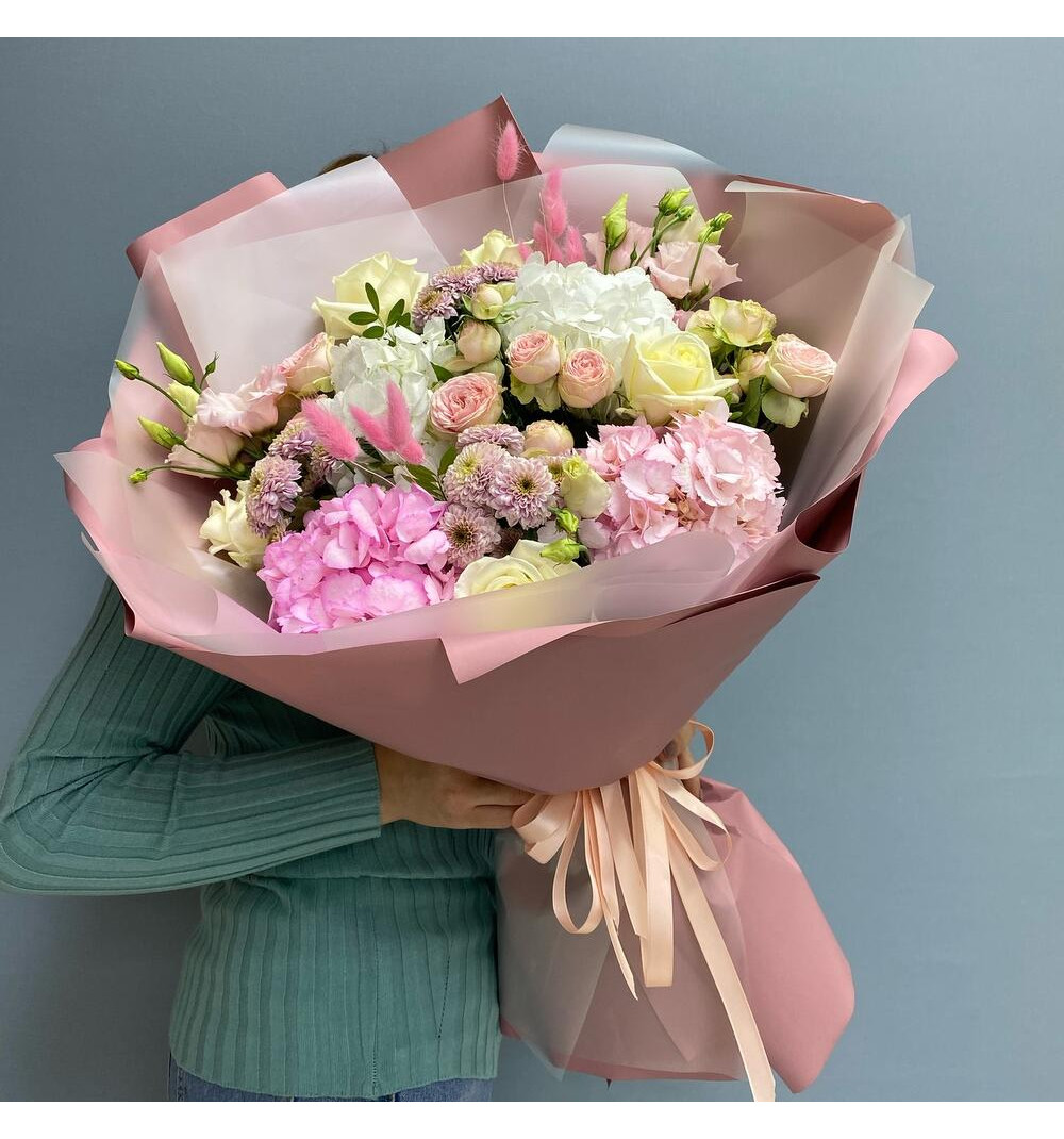 Авторский букет - это удивительное цветочное произведение искусства, в котором собраны самые прекрасные и изящные цветы. В этом букете вы найдете 4 великолепных гортензии, приносящих изобилие и благополучие, а также 5 роз и 3 кустовых розы, которые добавляют нотки романтики и красоты. Букет украшен эустомой, сантини и лагурусом, что придает ему неповторимый шарм и свежесть. Он упакован в дизайнерскую упаковку, что придает ему особый стиль и элегантность. Подарите этот уникальный авторский букет, чтобы выразить свои чувства и сделать день вашего близкого еще более особенным.