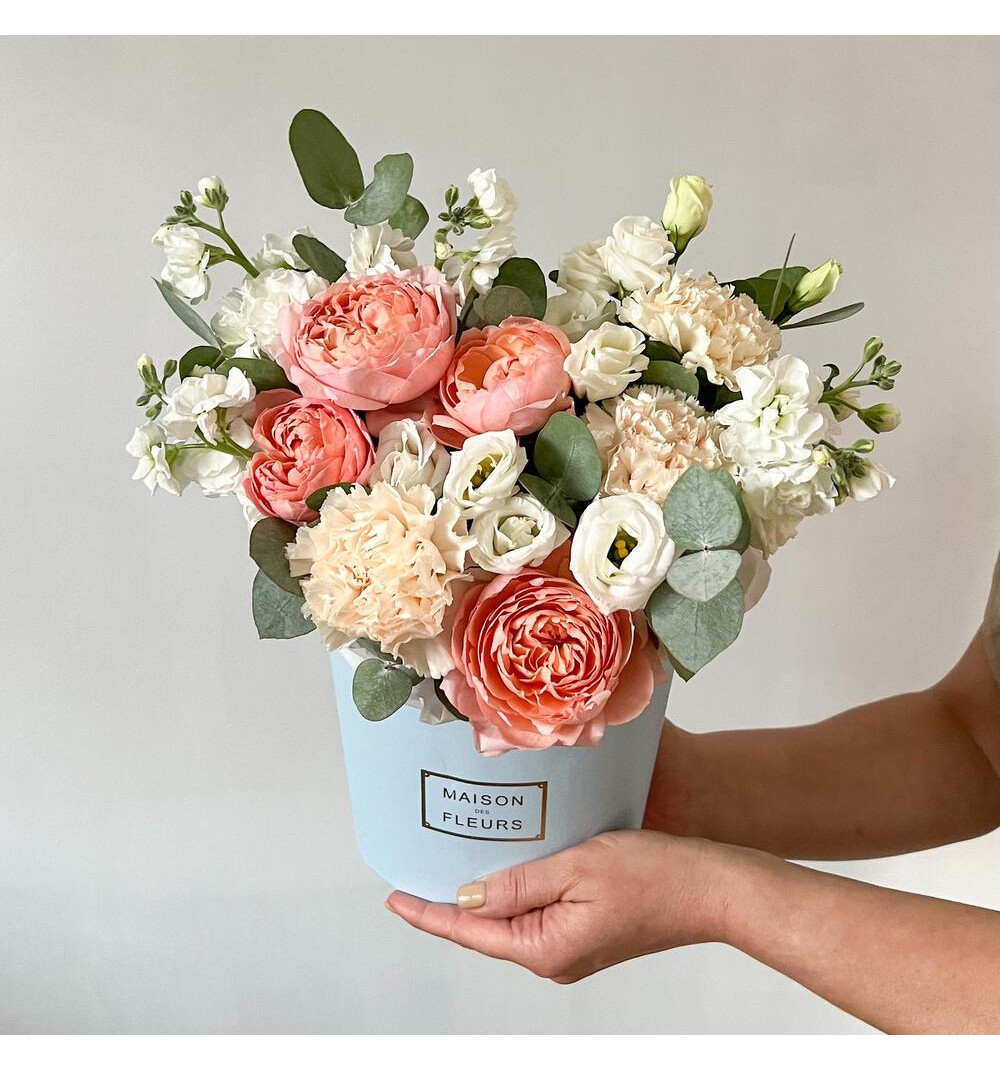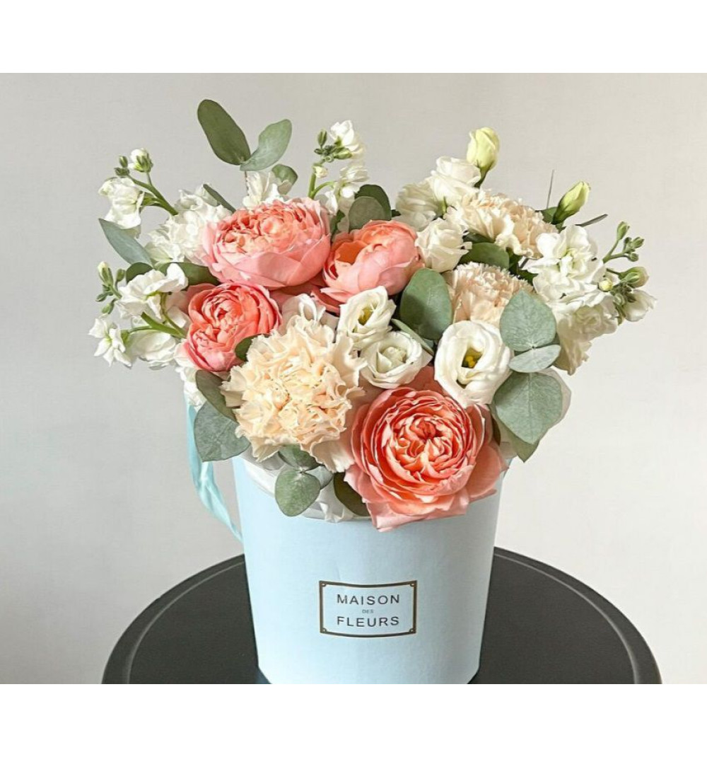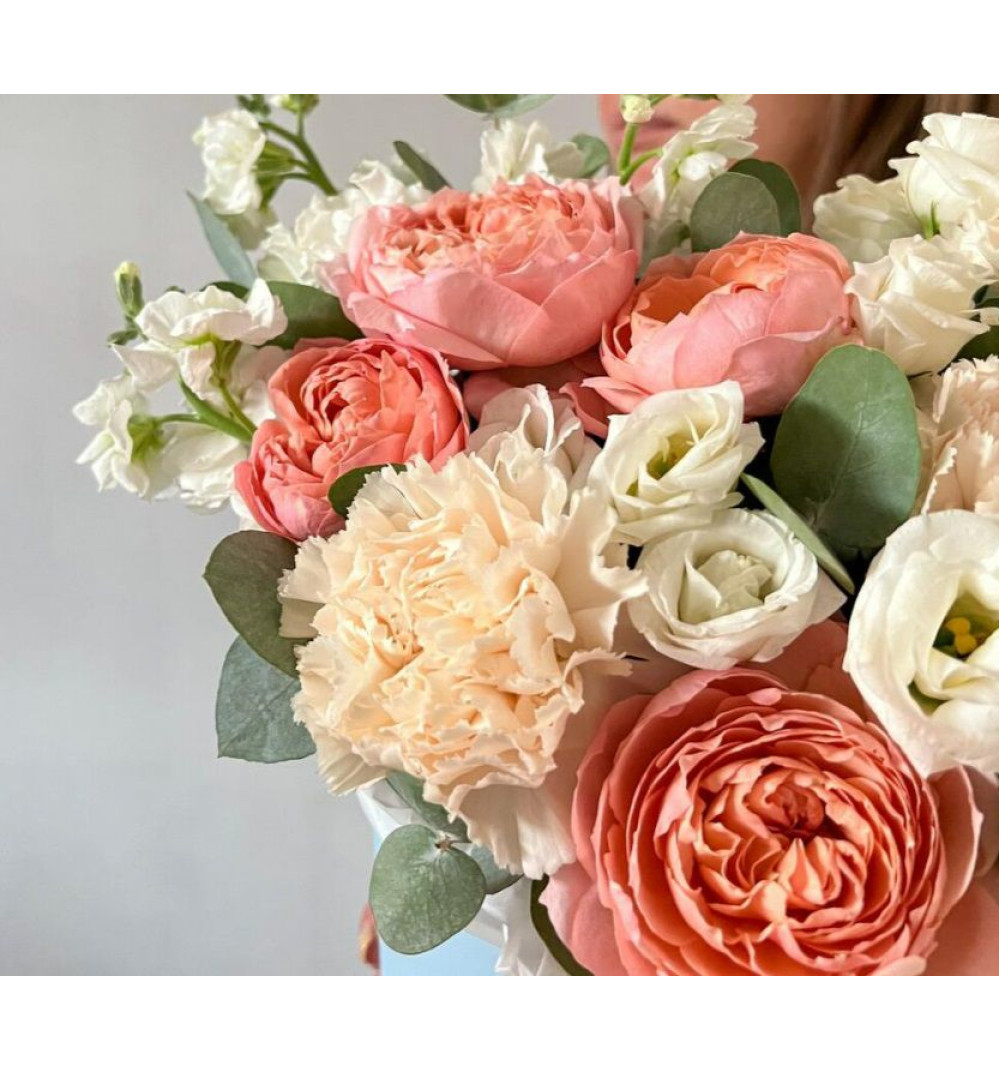 Купить Композиция с персиковыми пионовидными розами и маттиолой. в Лисаковске за 25 000 ₸ | интернет-магазин «Guls»