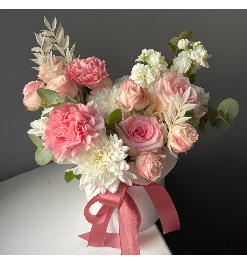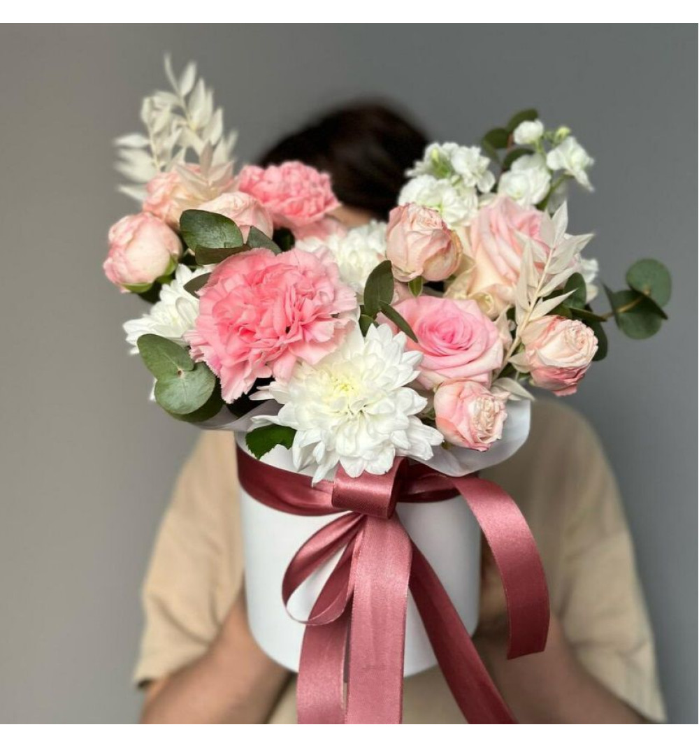 Купить Кустовые пионовидные розы, маттиола и хризантема в шляпной коробочке в Лисаковске за 15 000 ₸ | интернет-магазин «Guls»